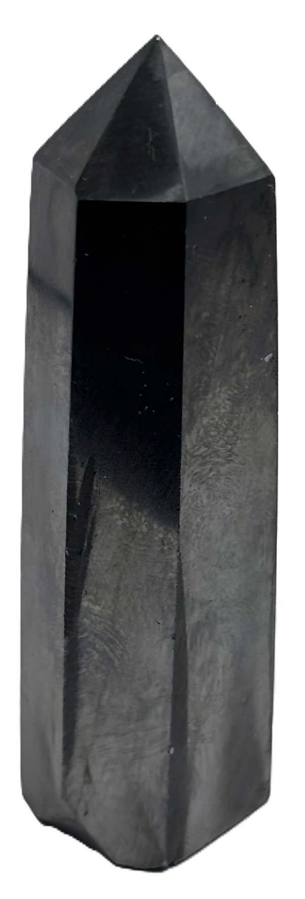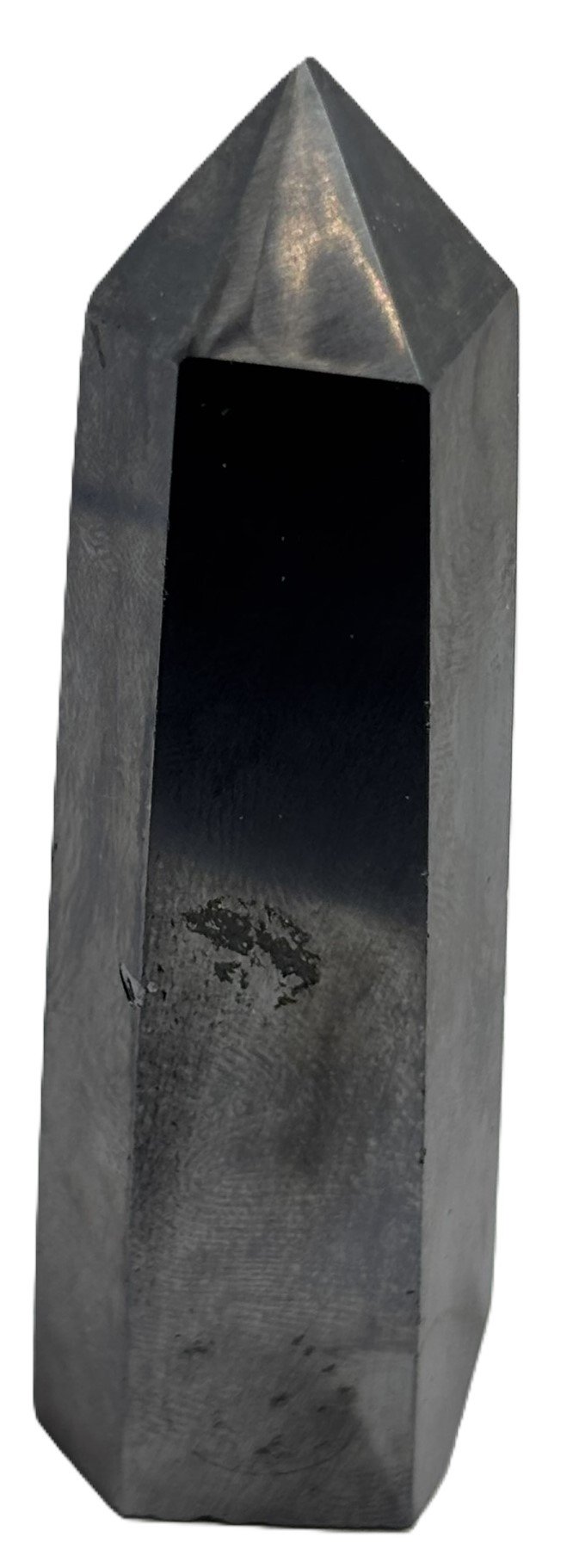 Hematite 6-sided point: polished top reflects strength and focus, while natural sides ground and protect. Ideal for meditation, energy work, or display.
