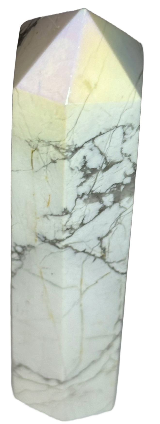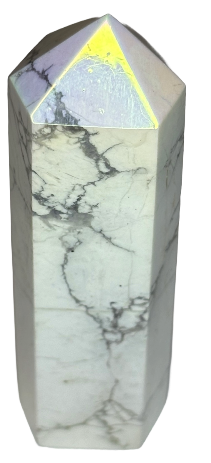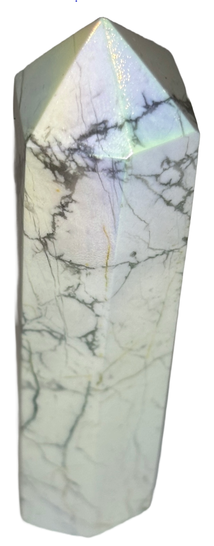 This is one of my Aura Howlite points, combining all the power of Howlite with a radiant rainbow shimmer. Shaped into a point, it focuses the stone’s energies.