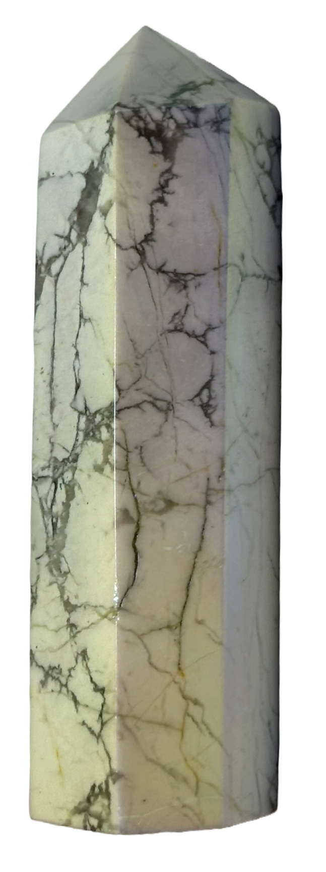 This Aura Howlite Point is point is 76.46mm high x 18.97mm long x 18.97mm wide and weighing 75 grams
