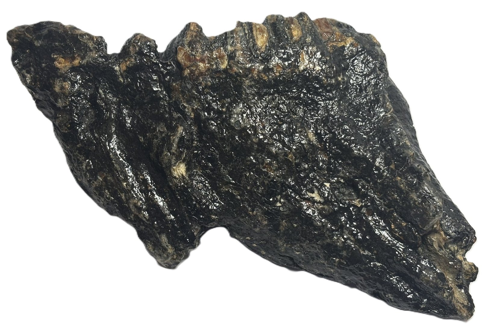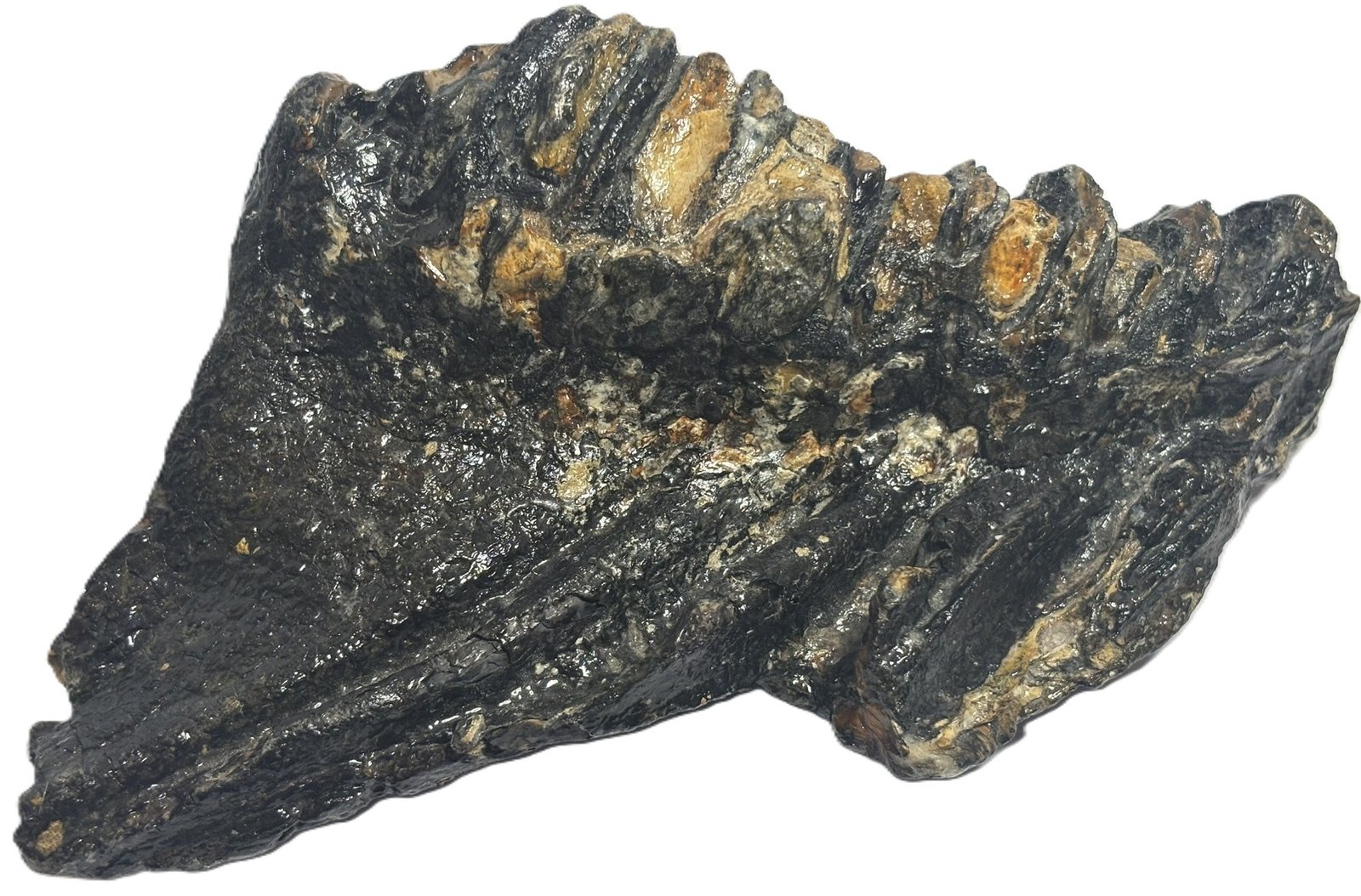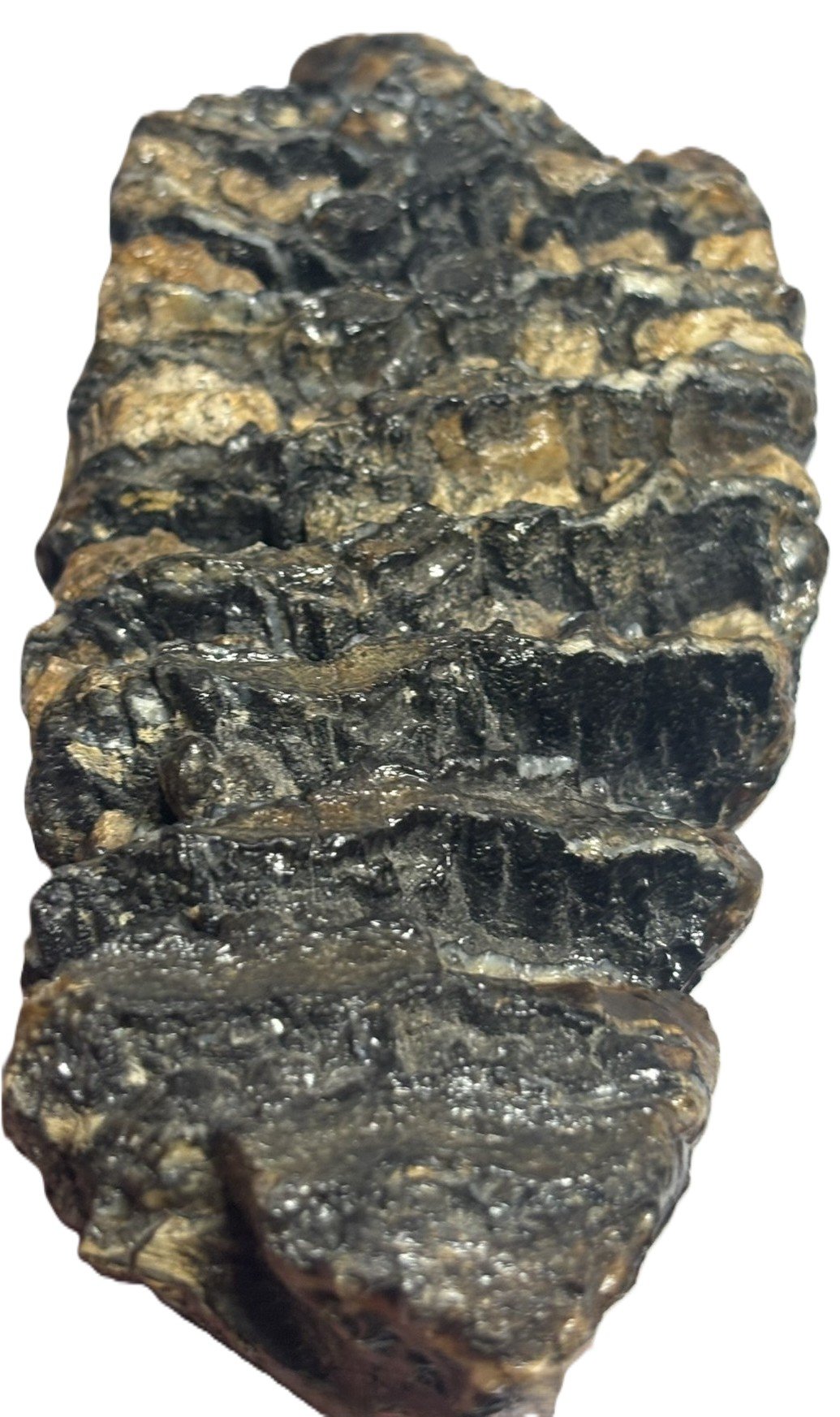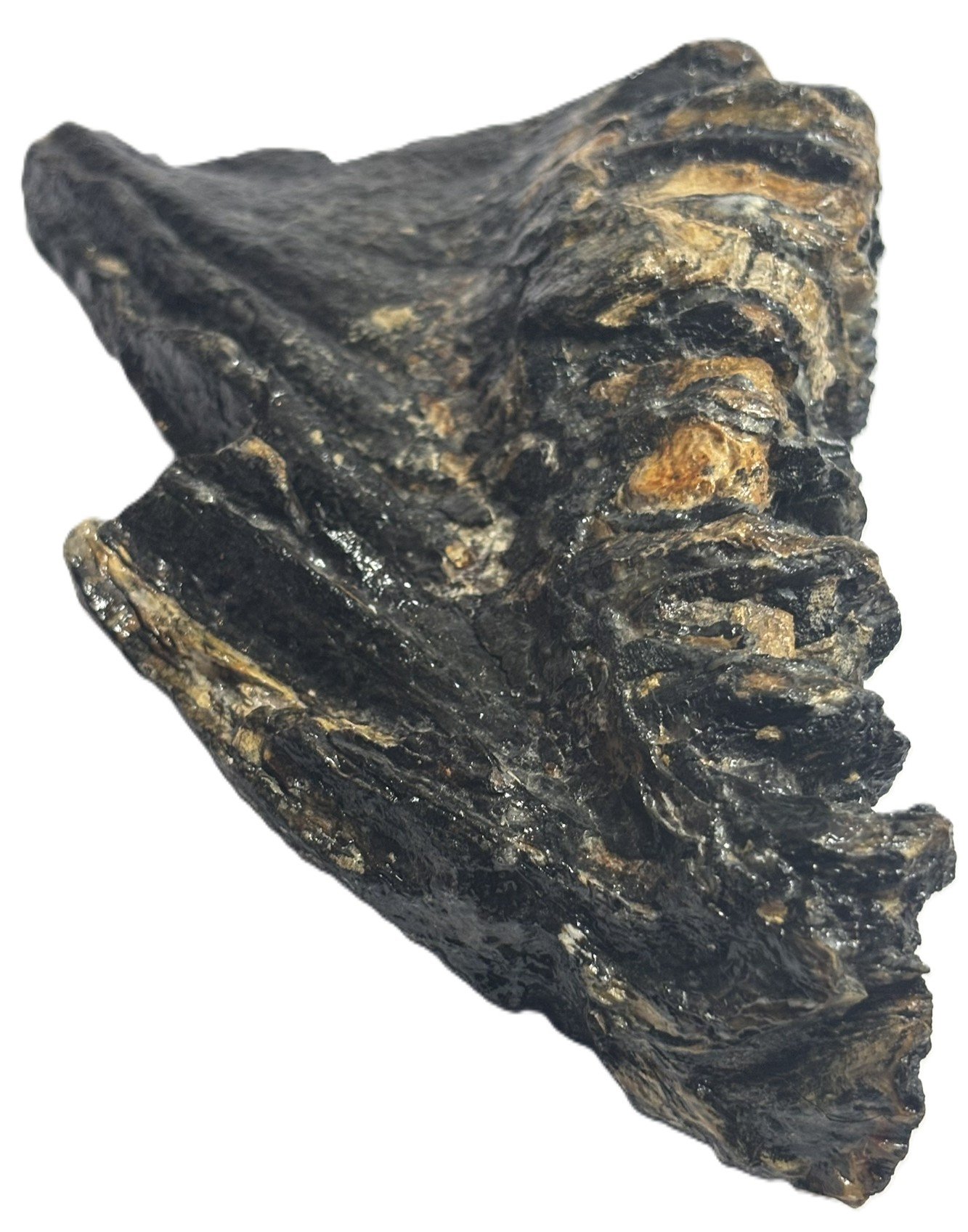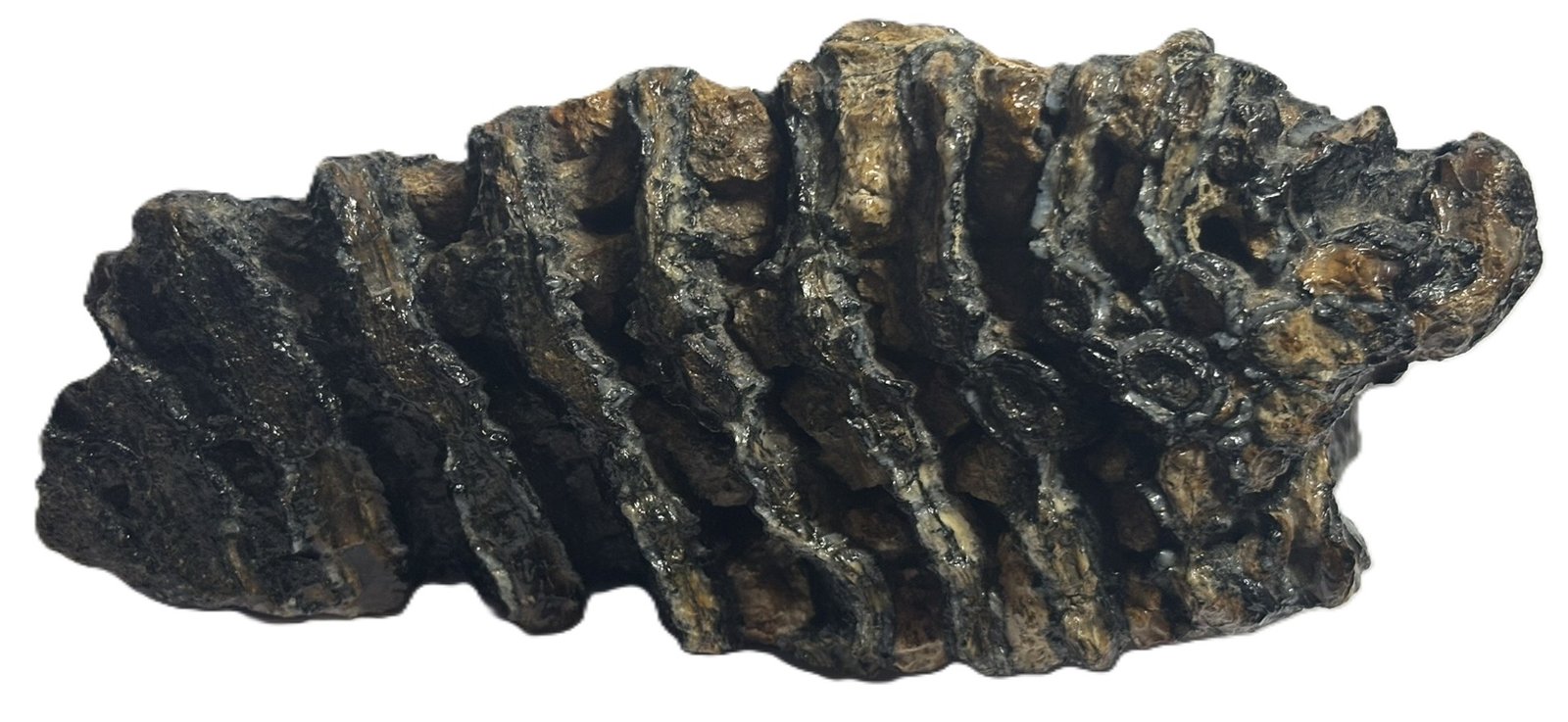 This authentic mammoth tooth fossil features natural sedimentary tones and well-defined ridges, preserved over 10,000 years.