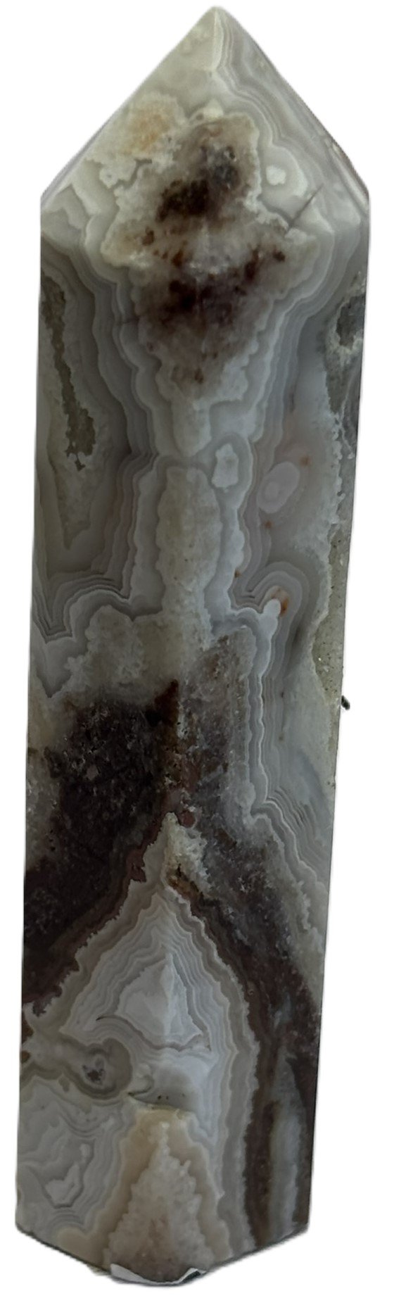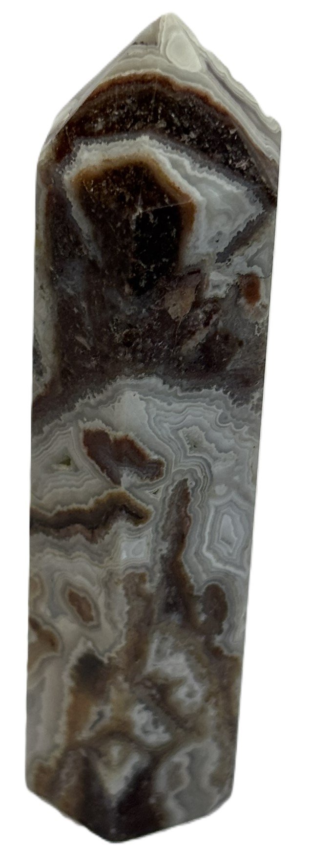Add a touch of natural artistry to your collection with this stunning Crazy Lace Agate point. Crazy lace agate is celebrated for its intricate banding patterns and vibrant colours, including shades of grey, white, and brown. This polished point showcases swirling designs that create a mesmerising effect, making it a perfect centrepiece for your home or workspace.