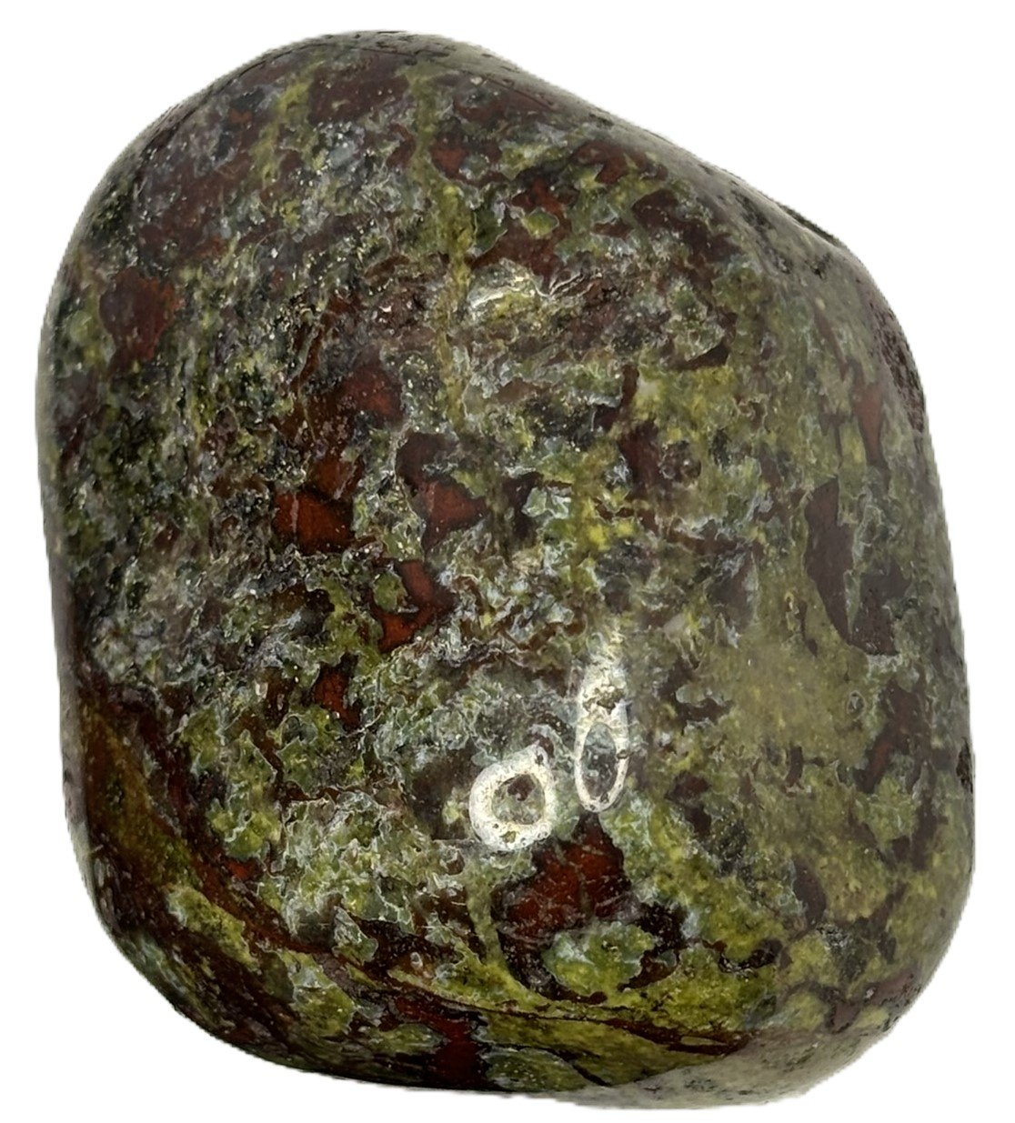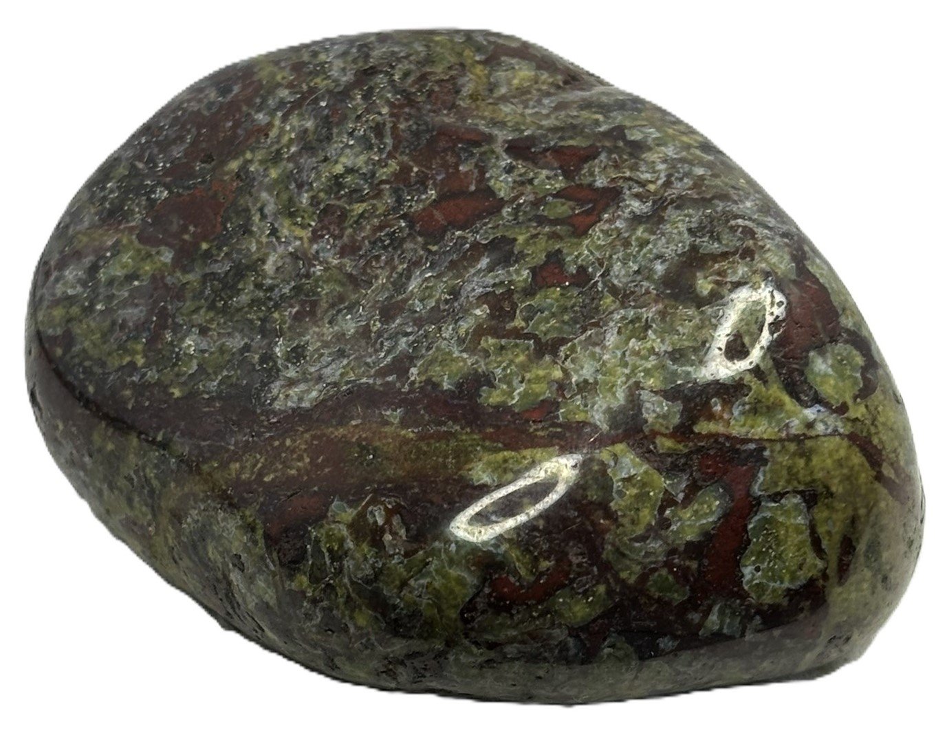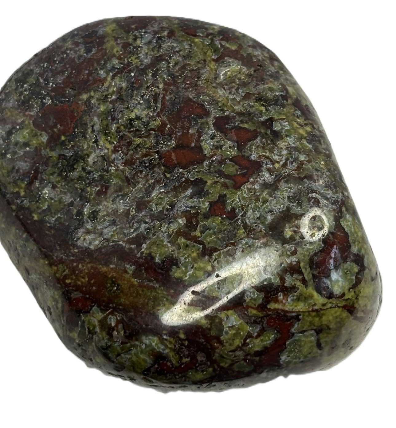 Unveil the mystique of this Polished Dragon Blood Jasper Tumblestone, a gemstone that captivates with its unique interplay of colours and natural patterns. This smooth, oval-shaped stone boasts a glossy finish, showcasing a striking blend of deep red veins intertwined with earthy green tones, reminiscent of a dragon’s scales. Its intricate design, created by nature itself, makes each tumblestone one-of-a-kind.