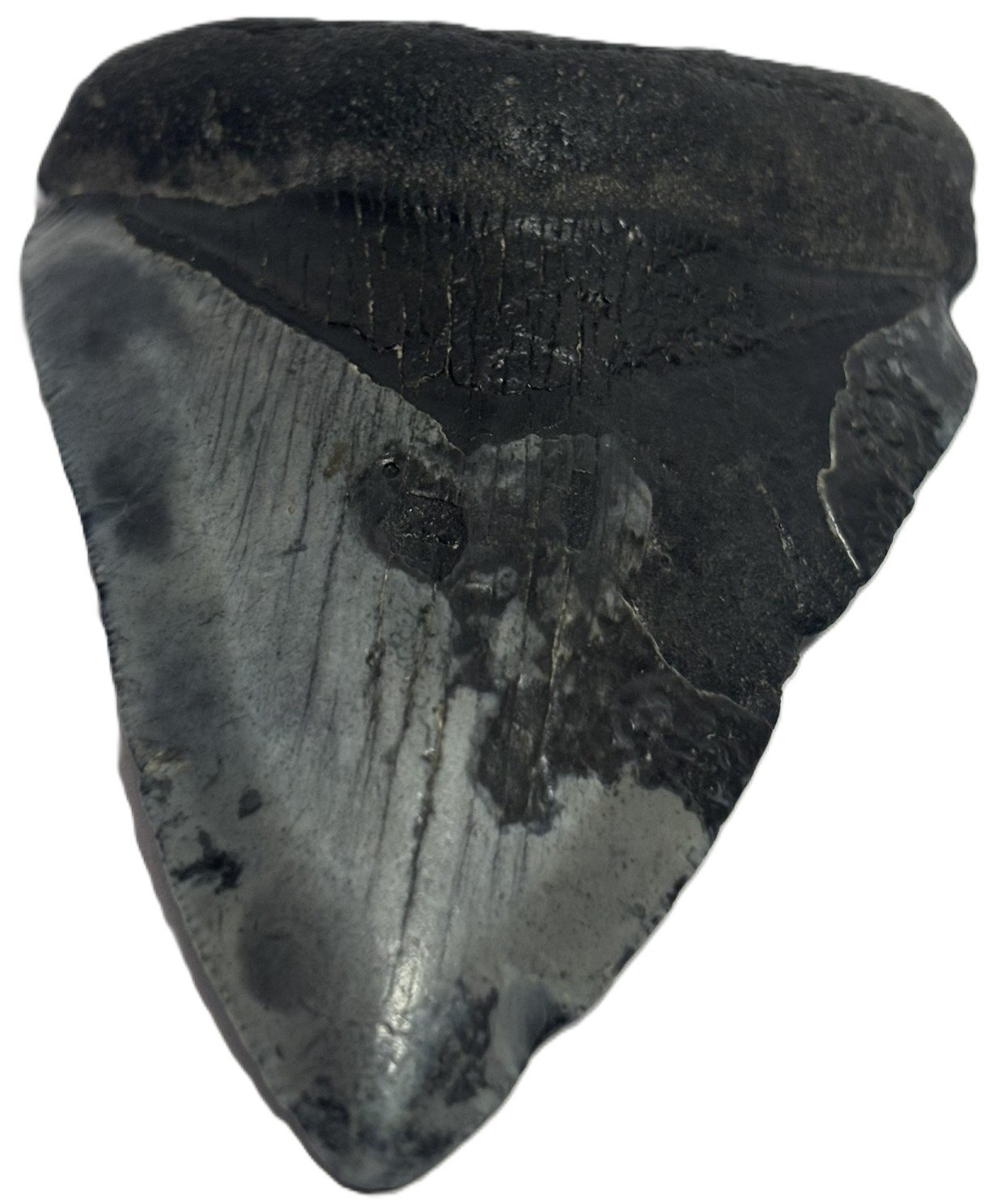 This Fossilised Megalodon Tooth unearthed from ancient seabed’s, this genuine fossilised megalodon tooth offers a rare glimpse into the primeval oceans once ruled by the largest predatory shark in history. With its sharply defined triangular form, the tooth displays a striking contrast between the dark, weathered enamel of the upper section and the smoother, lighter root below. Distinct striations and natural wear patterns attest to its age and the immense forces it once endured.