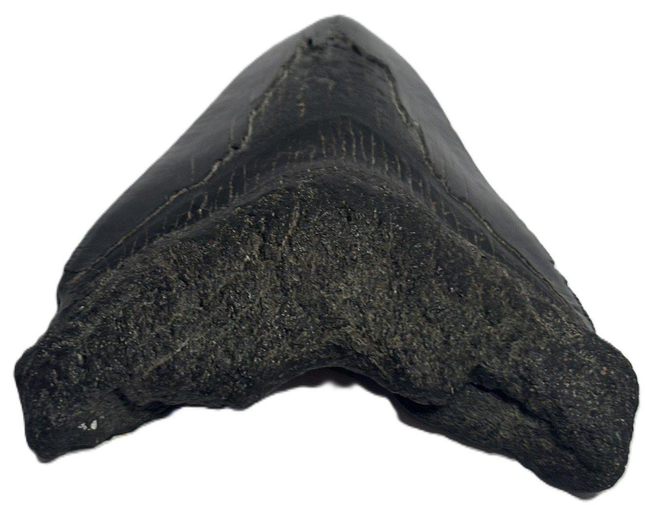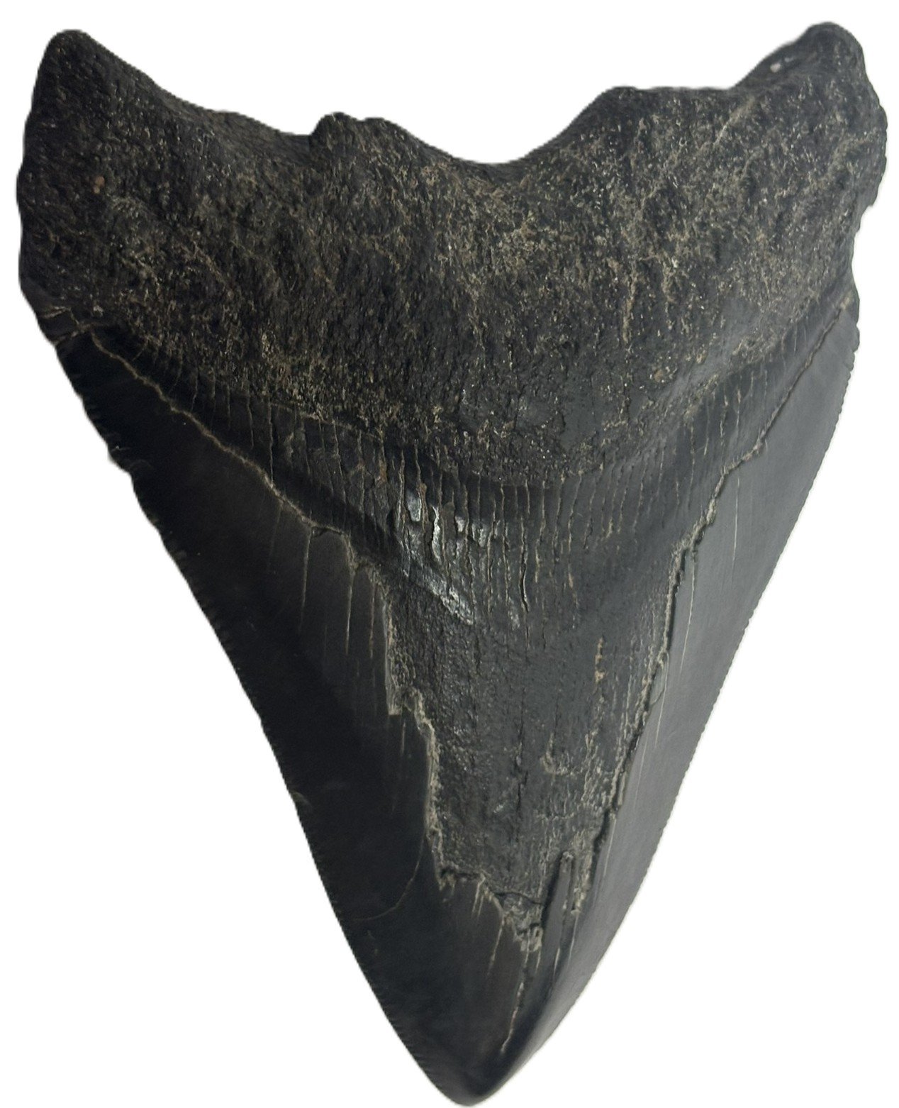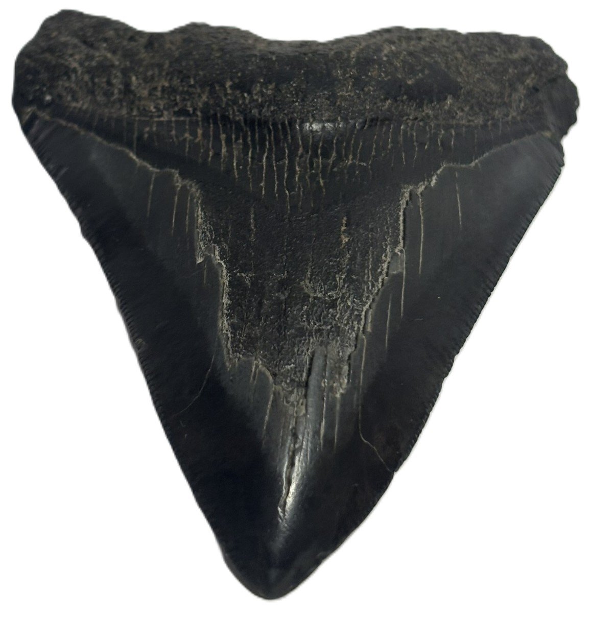 This Fossilised Megalodon Tooth unearthed from ancient seabed’s, this genuine fossilised megalodon tooth offers a rare glimpse into the primeval oceans once ruled by the largest predatory shark in history. With its sharply defined triangular form, the tooth displays a striking contrast between the dark, weathered enamel of the upper section and the smoother, lighter root below. Distinct striations and natural wear patterns attest to its age and the immense forces it once endured.