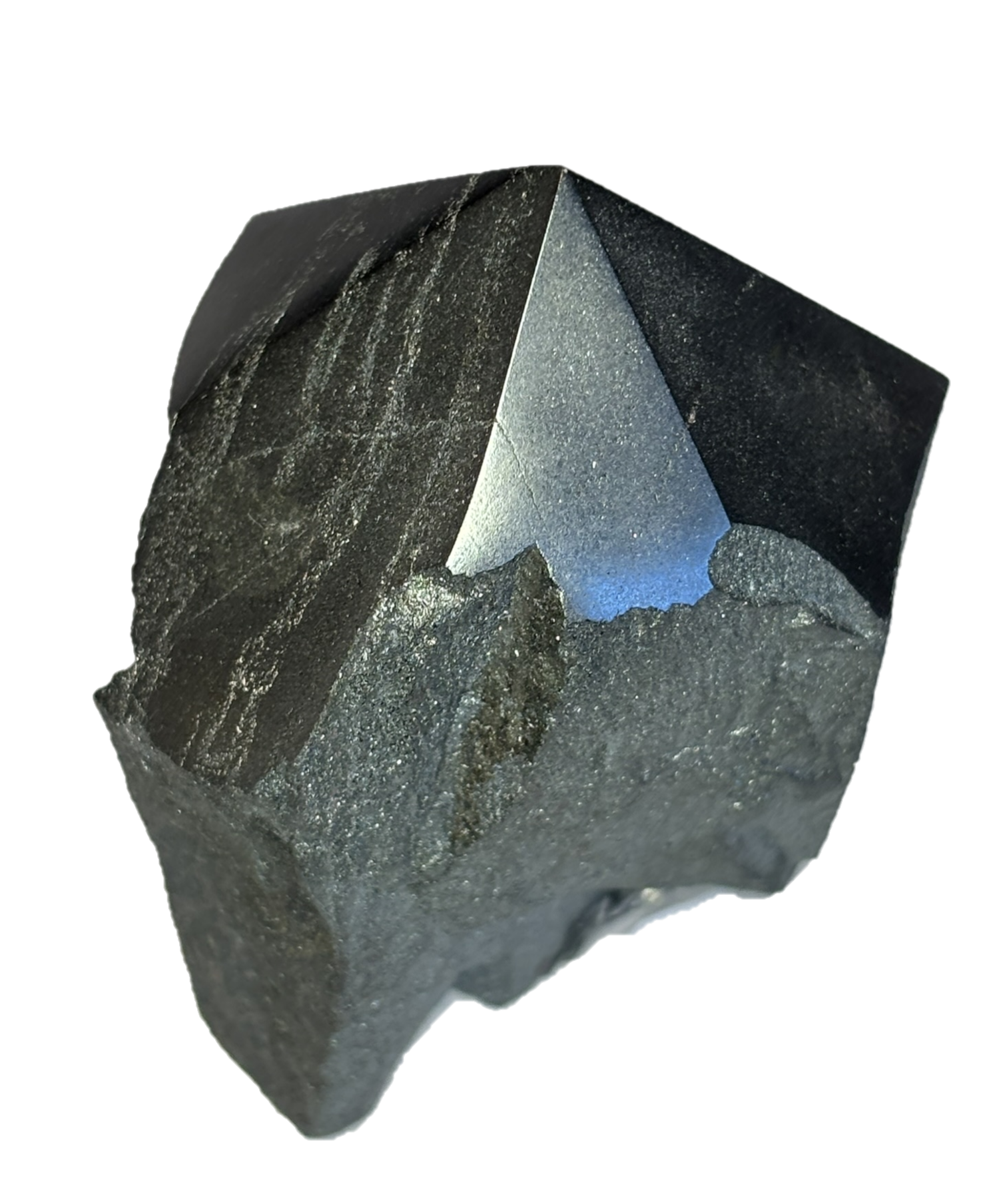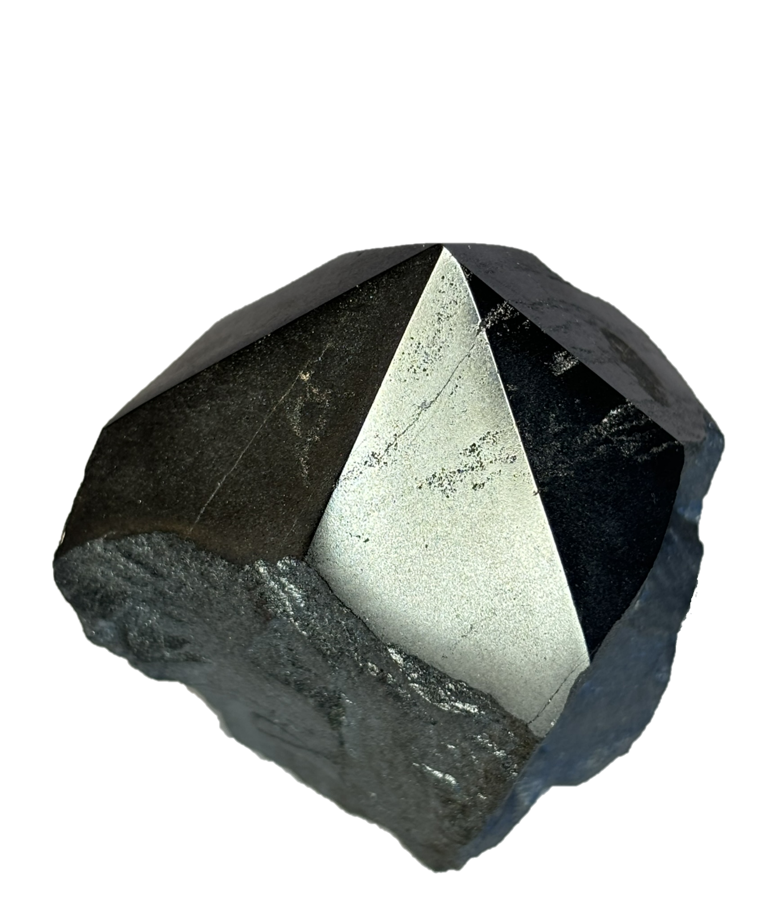This striking hematite point is a harmonious blend of nature’s rugged essence and meticulous craftsmanship. Featuring a sleek, cut, and polished top, it highlights hematite’s signature metallic sheen and mirror-like reflection, embodying refinement and sophistication. In contrast, the natural, unpolished sides retain their raw texture, showcasing the stone’s organic origins and grounding energy.
