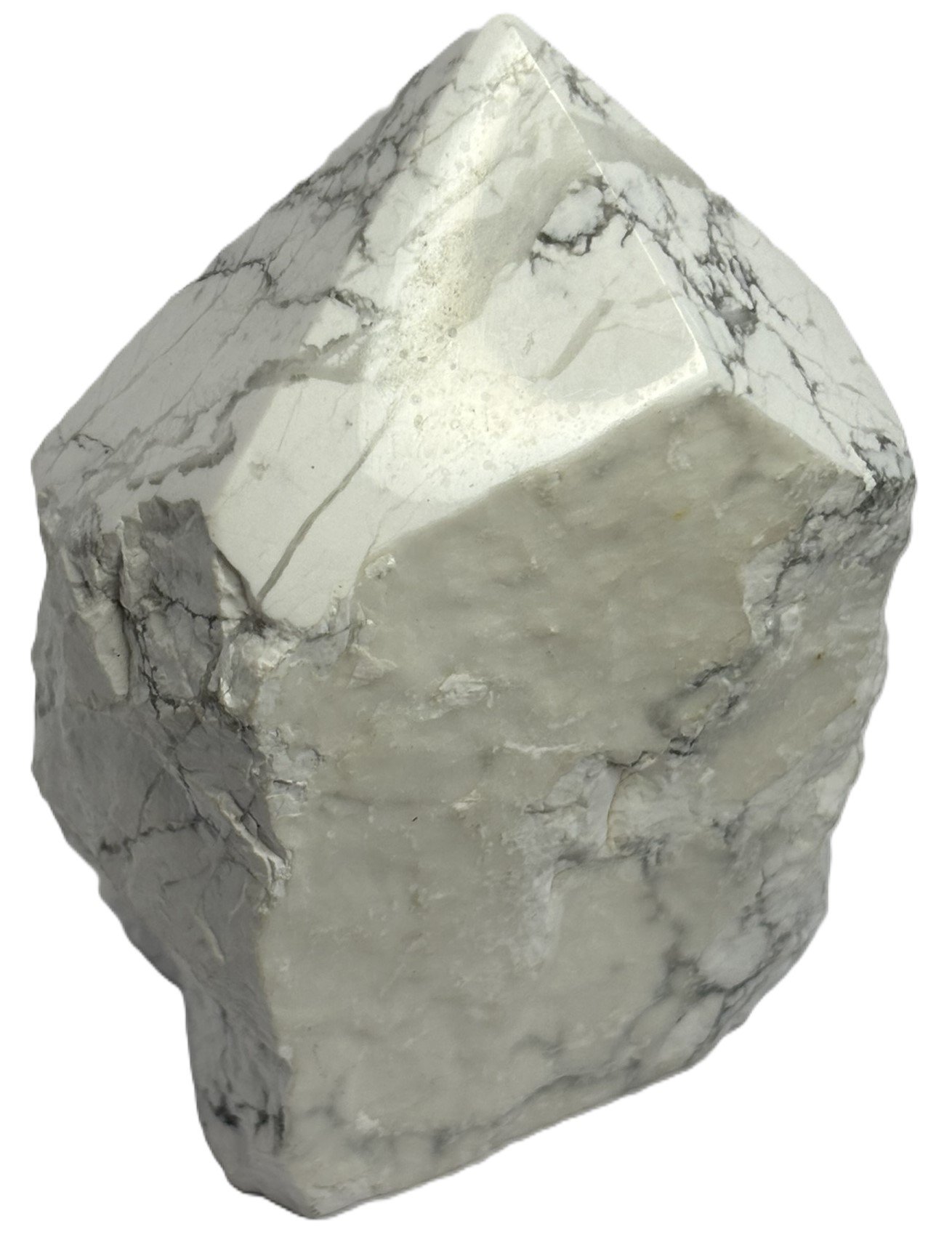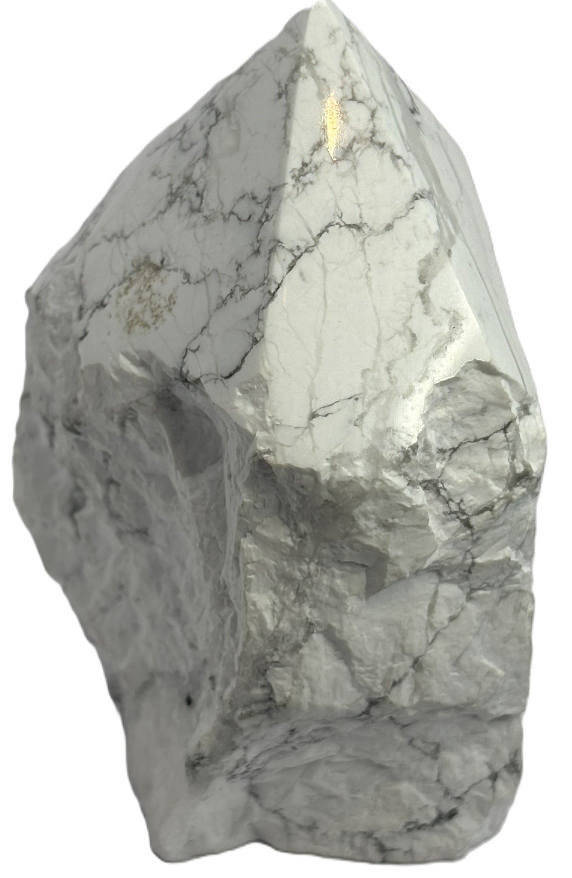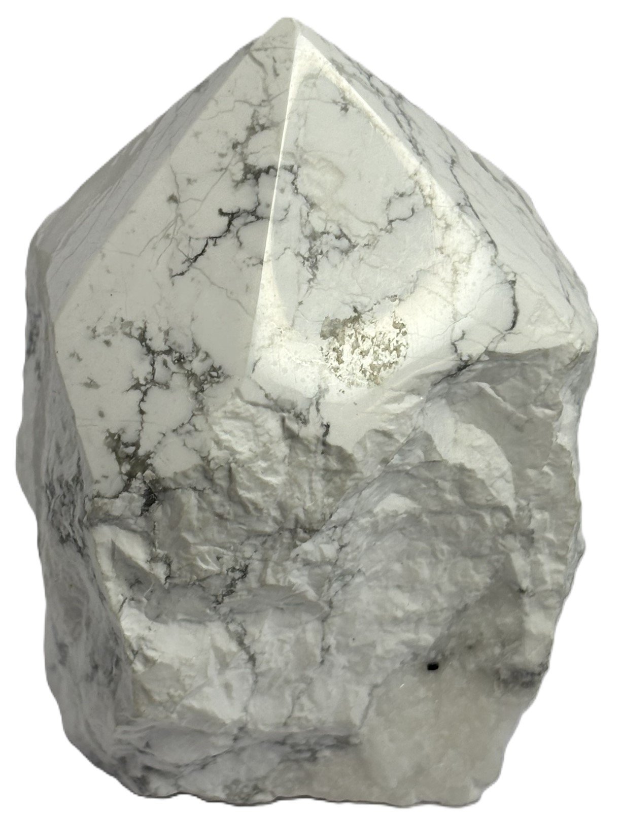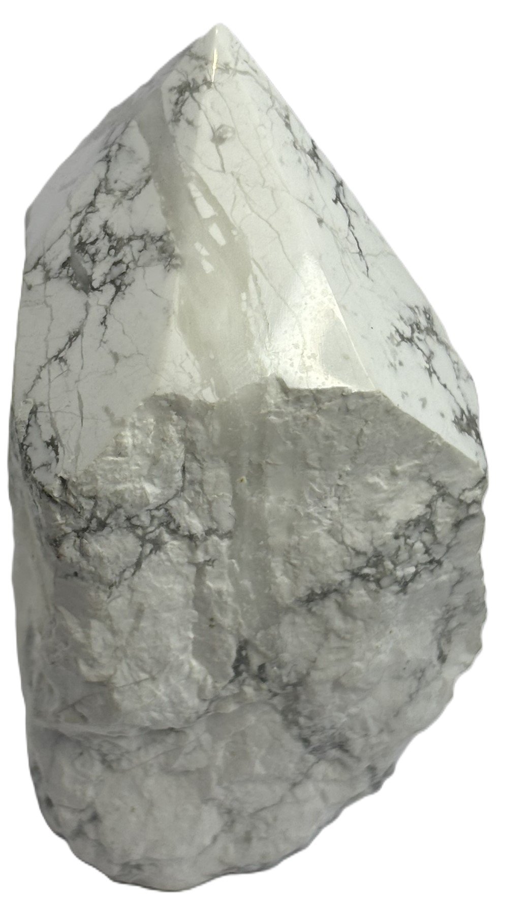 This striking Howlite point features a sleek, polished tip that gleams with soft white hues and delicate grey veining, while its natural sides remain raw and rugged—honouring the stone’s untamed origins. The contrast between the refined top and uncut body creates a powerful visual and energetic duality: clarity emerging from stillness.