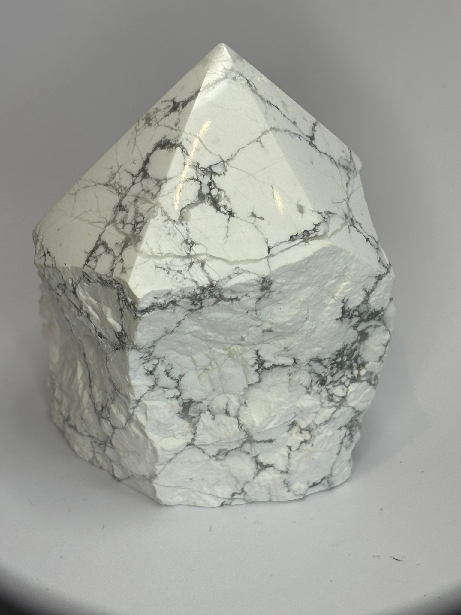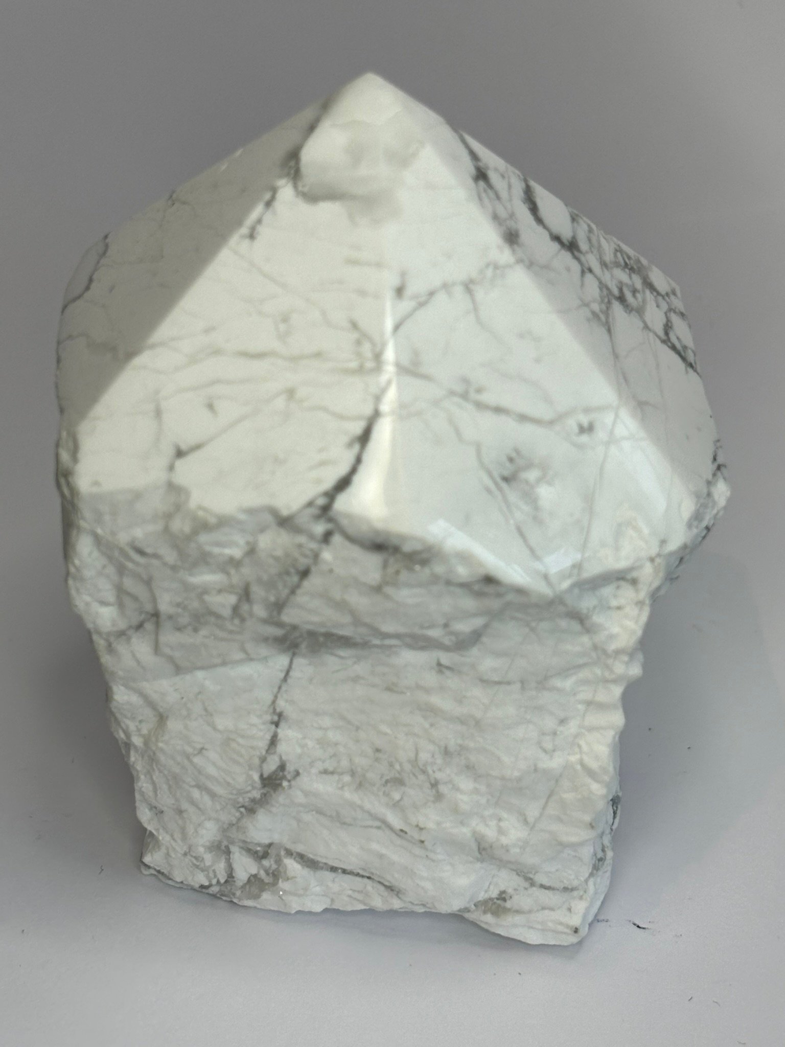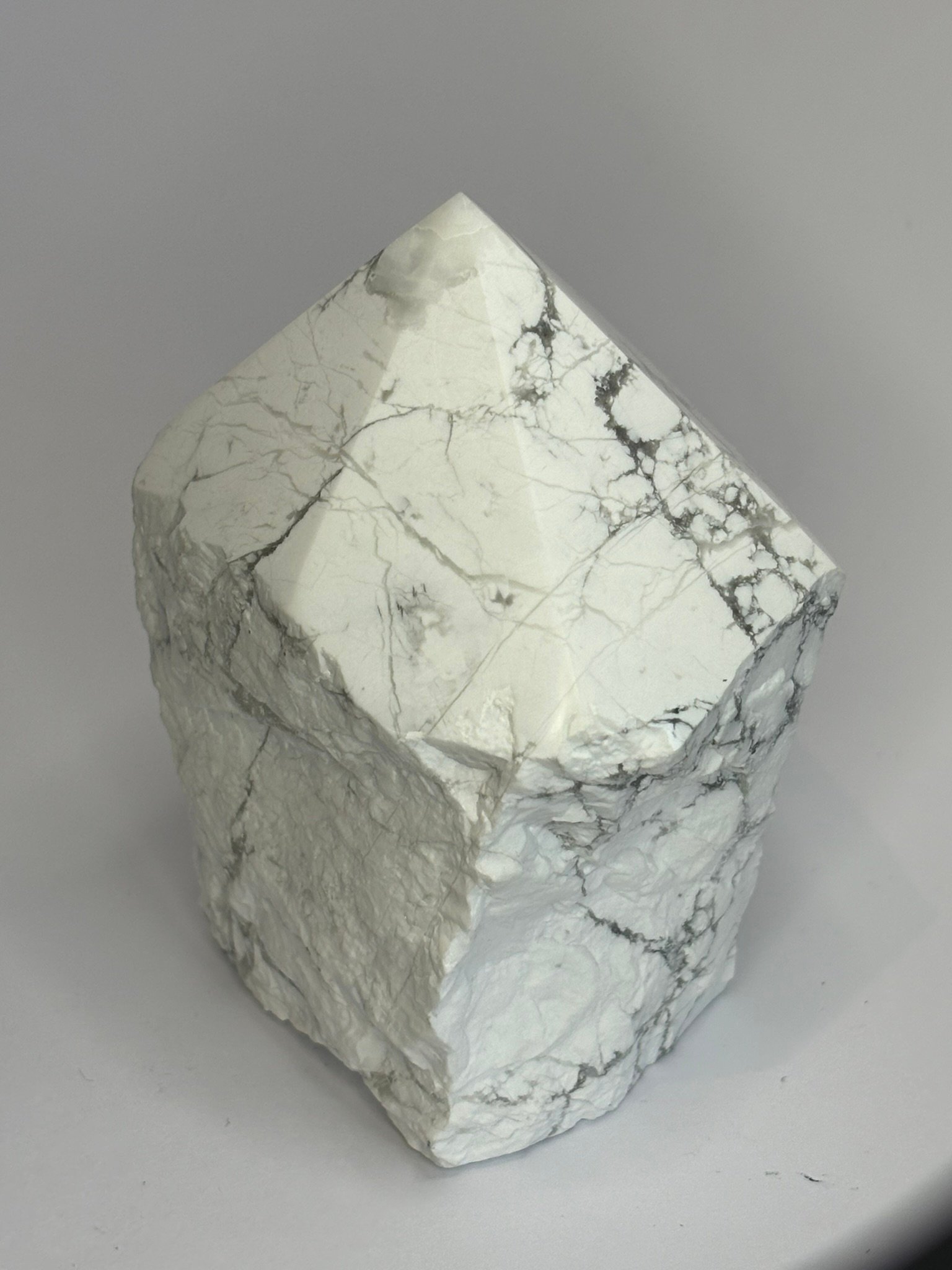 This striking Howlite point features a sleek, polished tip that gleams with soft white hues and delicate grey veining, while its natural sides remain raw and rugged—honouring the stone’s untamed origins. The contrast between the refined top and uncut body creates a powerful visual and energetic duality: clarity emerging from stillness.