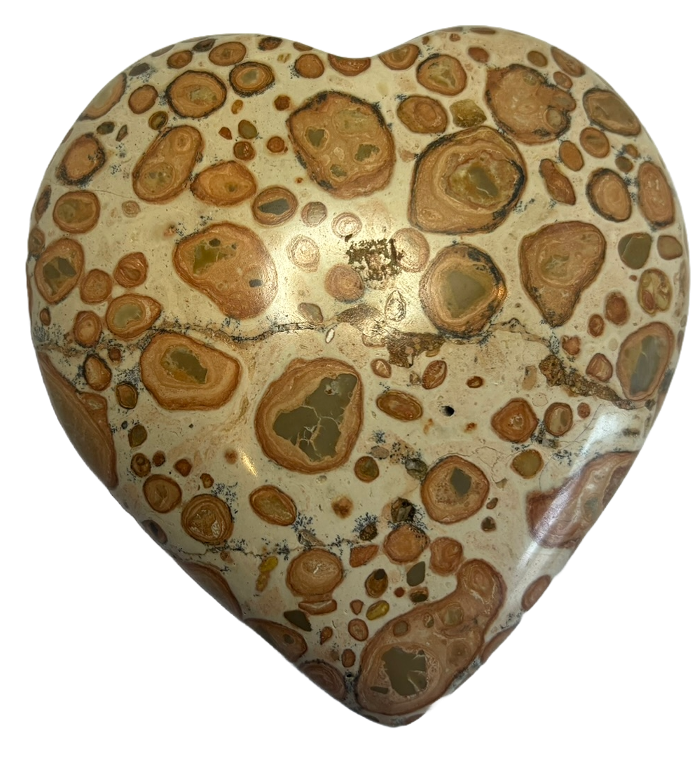 Shaped with intention and polished to a warm gloss, this Leopard Skin Jasper Heart pulses with earthy energy and primal beauty. Rich patterns in russet, tan, and mossy green unfurl across its surface, echoing the pelt of its namesake. Each orb and swirl resembles a hidden world—organic, untamed, and deeply rooted.