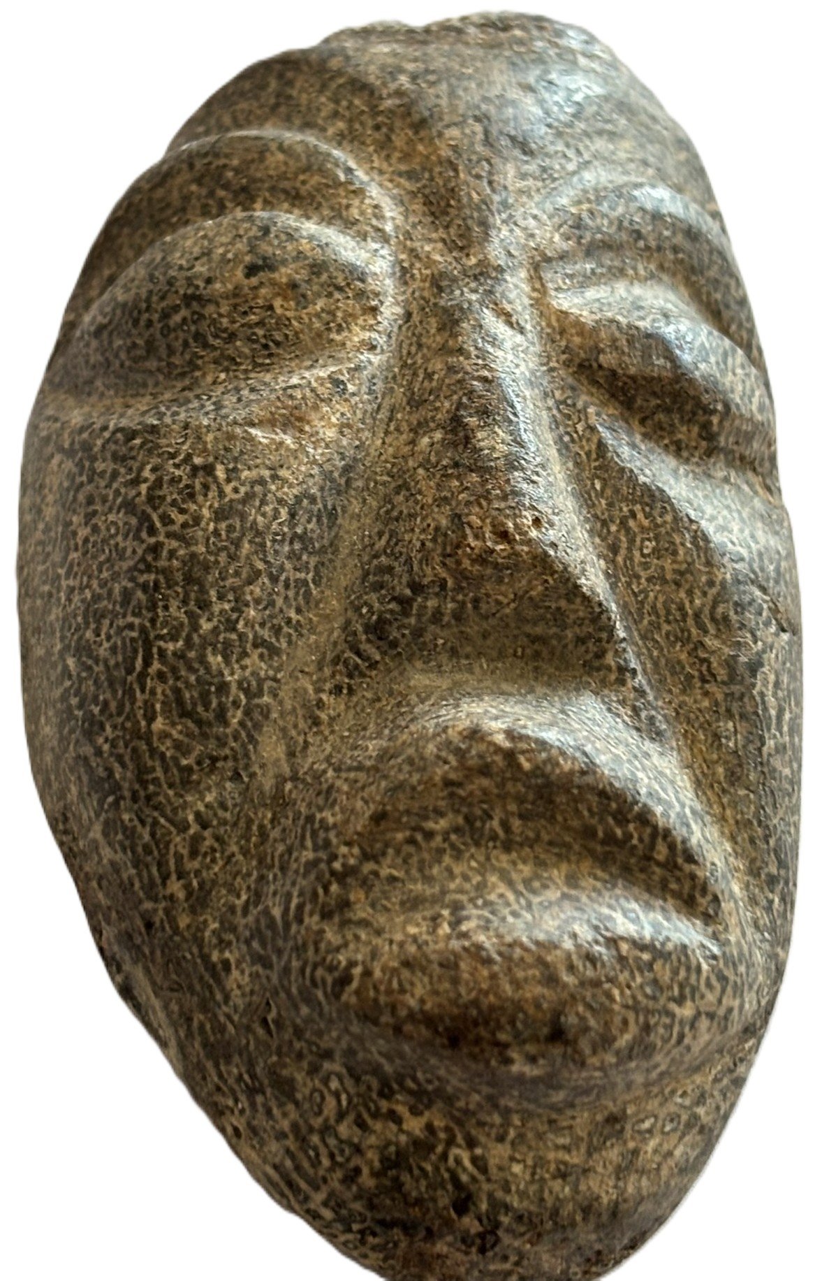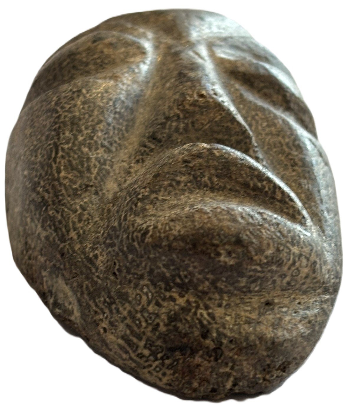 This Mastodon bone fossil face carving is from an ancient giant of the Pleistocene epoch. This striking piece depicts a stylised human face, etched with deliberate simplicity and primal elegance. The features are bold yet abstract: deep-set eyes, a prominent nose, and a solemn mouth, all emerging from the bone’s naturally weathered surface. Its earthy hues and mineralised grain evoke the passage of millennia, grounding the carving in deep time.
