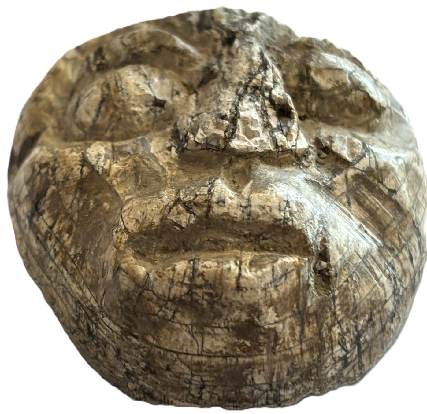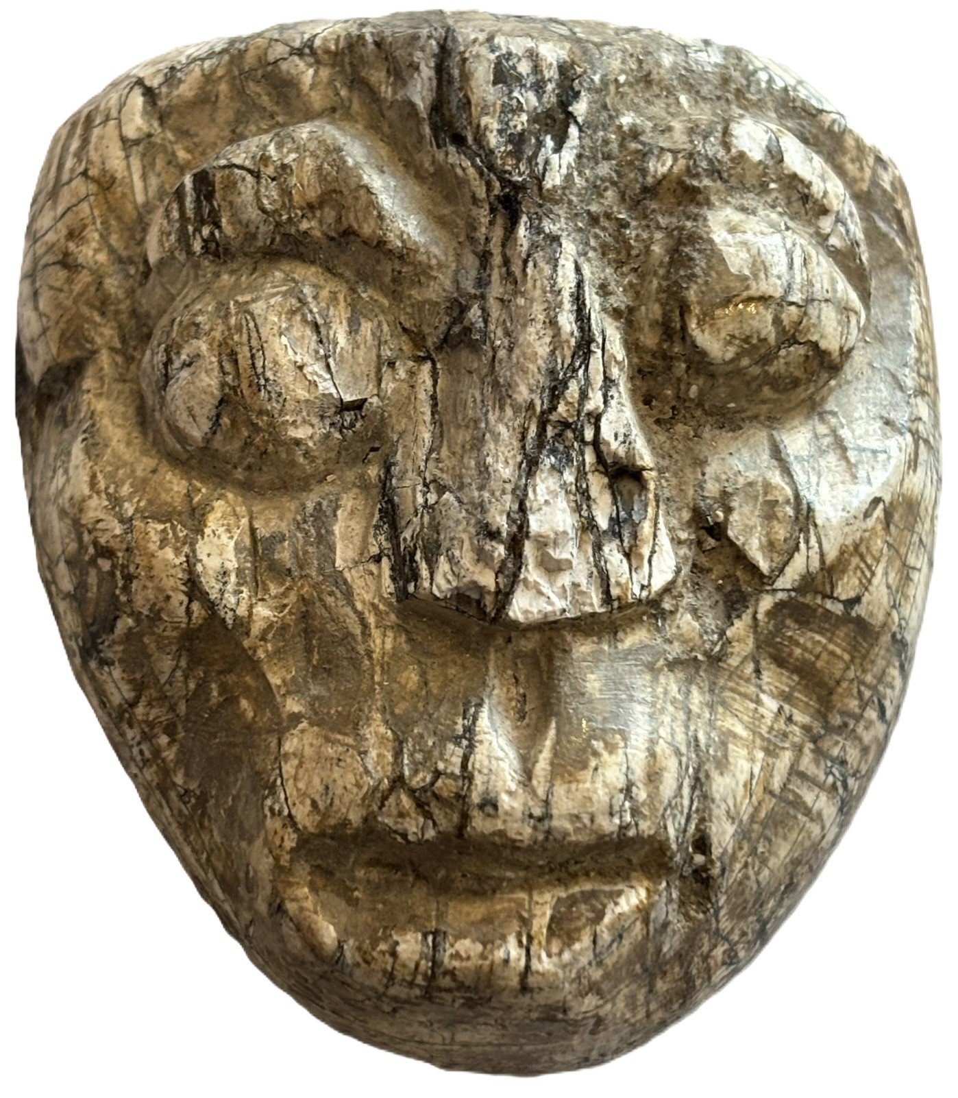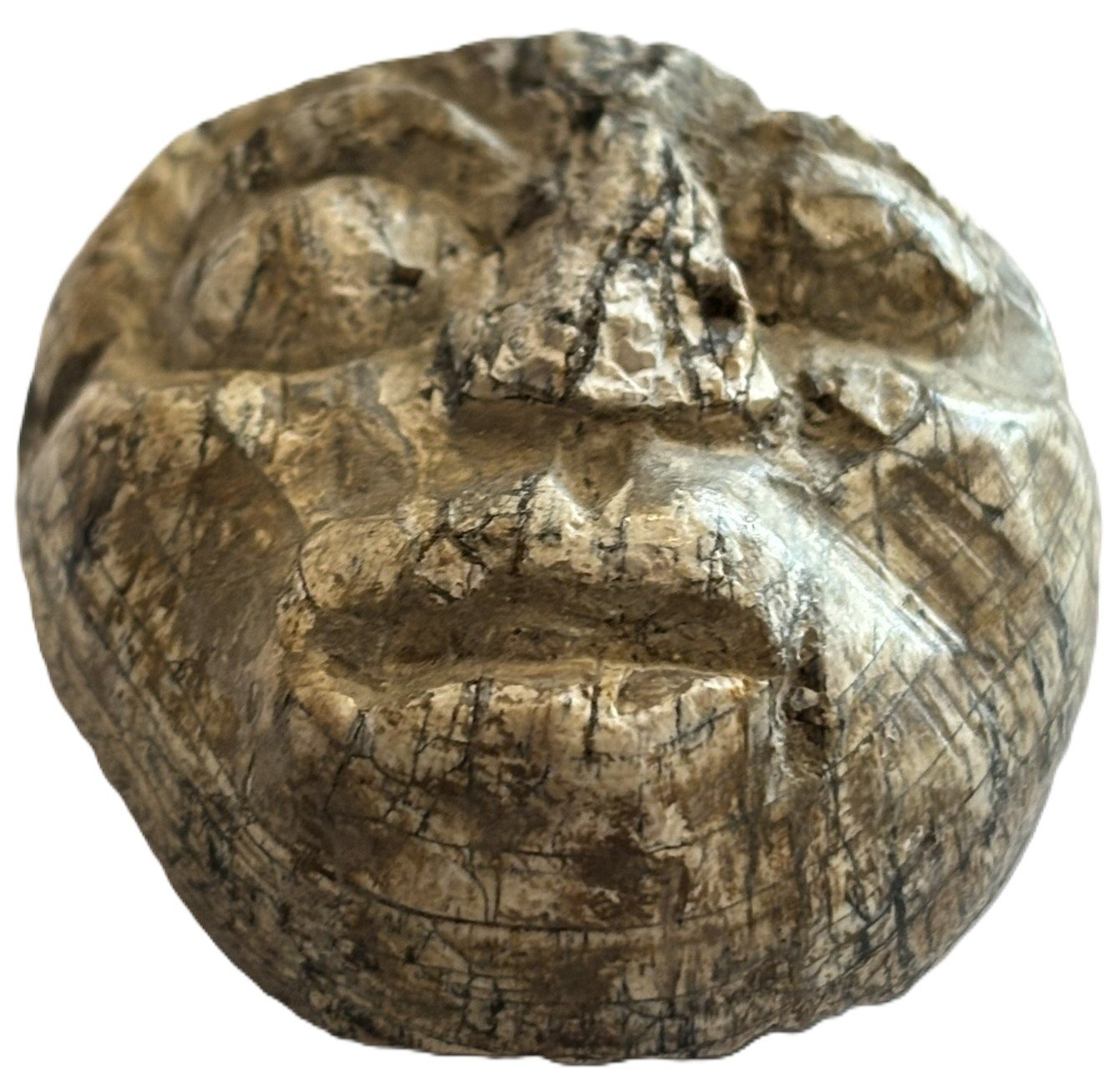 This Mastodon tusk fossil face carving is from an ancient giant of the Pleistocene epoch. This striking piece depicts a stylised human face, etched with deliberate simplicity and primal elegance. The features are bold yet abstract: deep-set eyes, a prominent nose, and a solemn mouth, all emerging from the tusk’s naturally weathered surface. Its earthy hues and mineralised grain evoke the passage of millennia, grounding the carving in deep time.