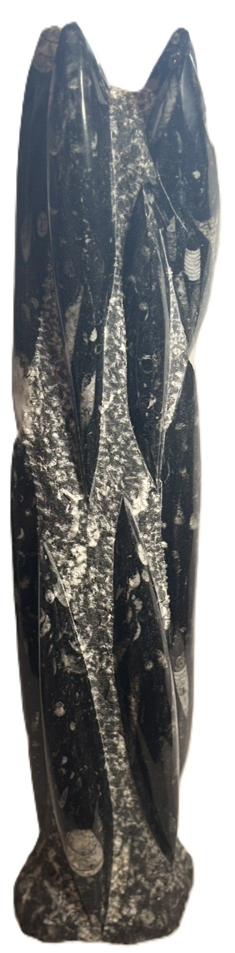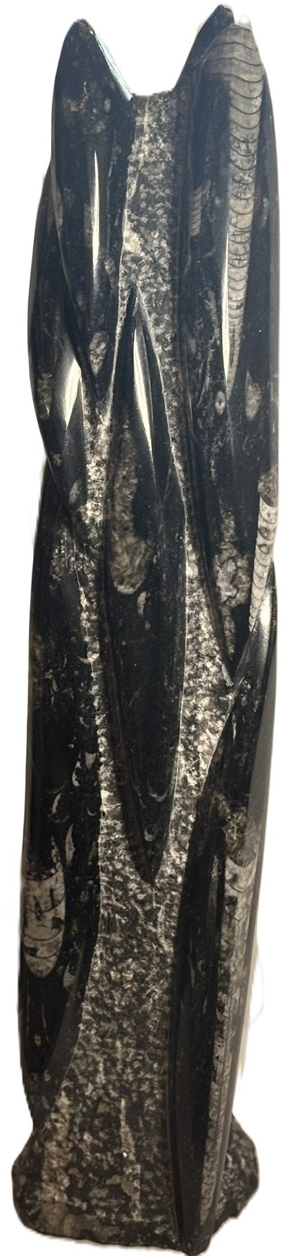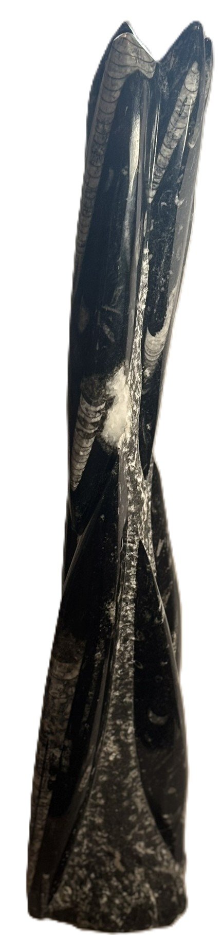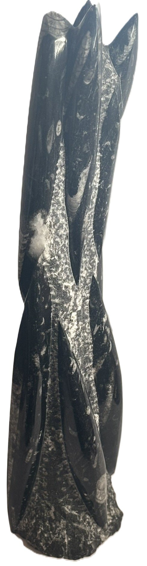 This hand-carved Orthoceras tower presents a vertical column of fossilised marine life from the Devonian period, over 400 million years in age. Sourced from the limestone beds of Morocco, each specimen showcases multiple Orthoceras shells embedded within a polished matrix, their chambered forms aligned in ascending order along the tower’s surface.