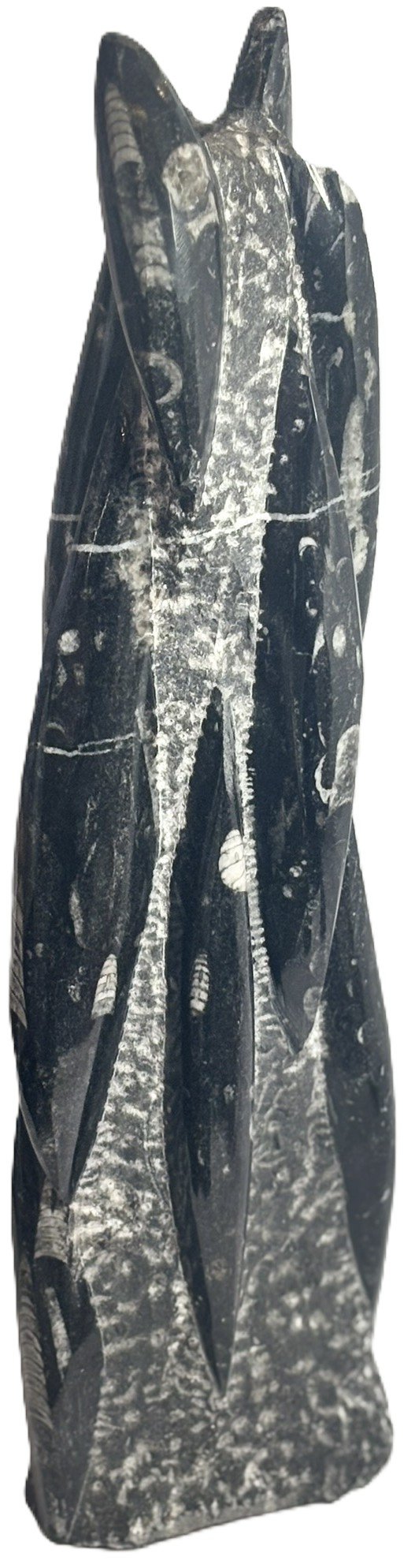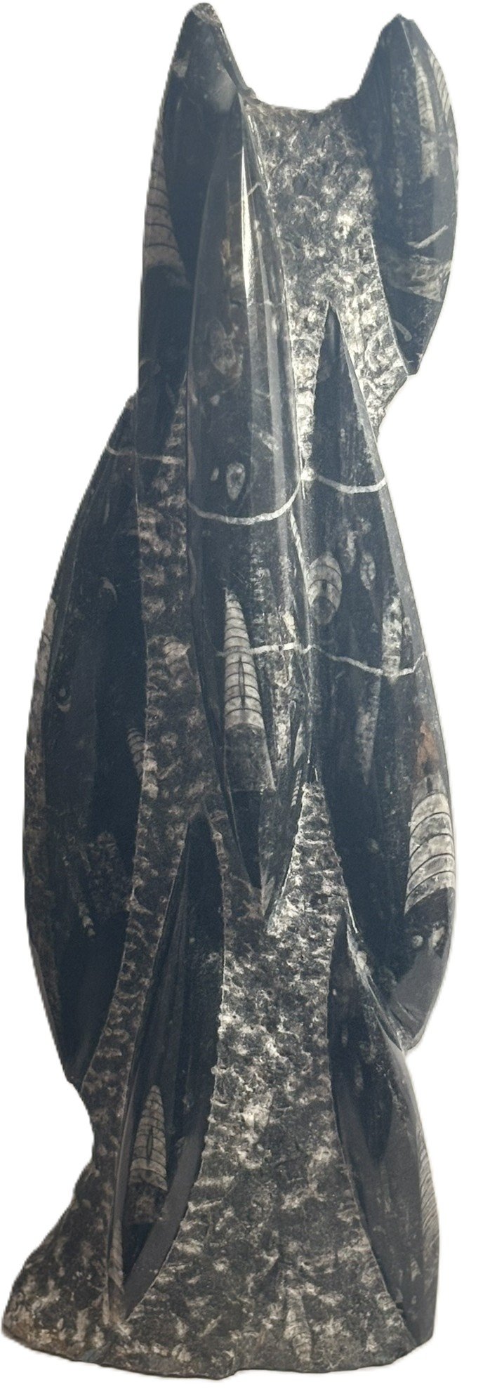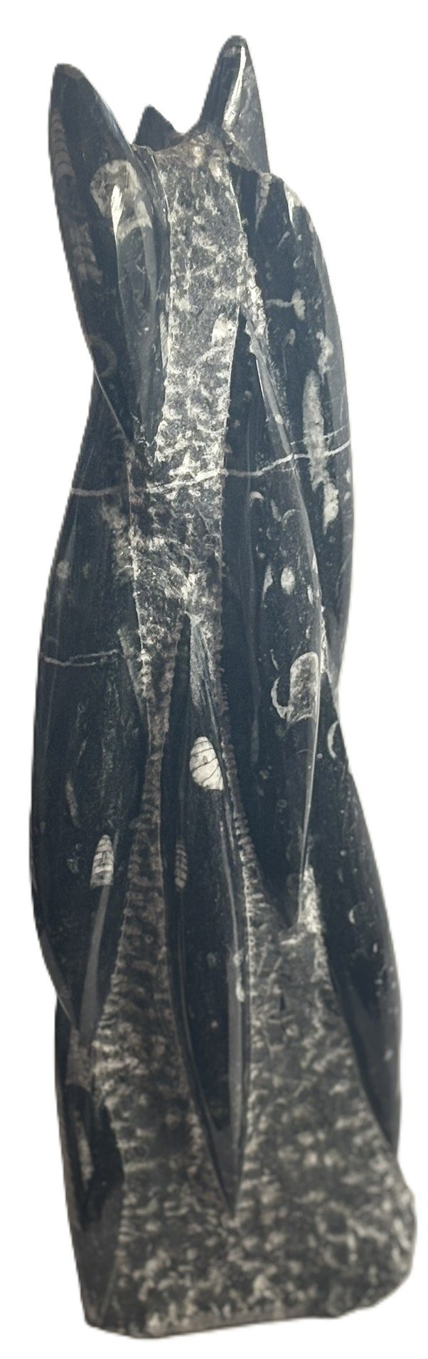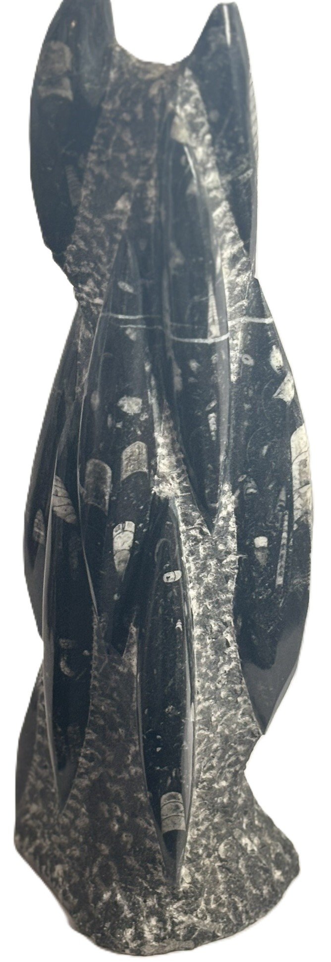 This hand-carved Orthoceras tower presents a vertical column of fossilised marine life from the Devonian period, over 400 million years in age. Sourced from the limestone beds of Morocco, each specimen showcases multiple Orthoceras shells embedded within a polished matrix, their chambered forms aligned in ascending order along the tower’s surface.