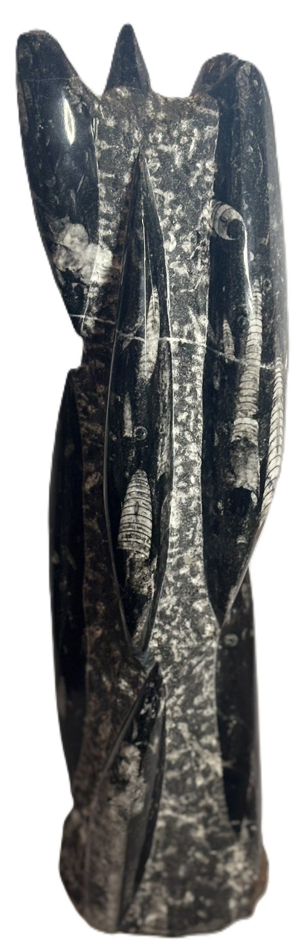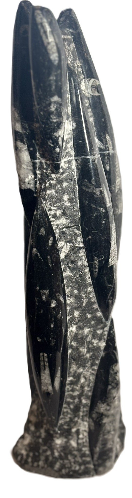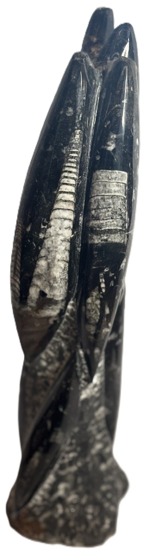 This hand-carved Orthoceras tower presents a vertical column of fossilised marine life from the Devonian period, over 400 million years in age. Sourced from the limestone beds of Morocco, each specimen showcases multiple Orthoceras shells embedded within a polished matrix, their chambered forms aligned in ascending order along the tower’s surface.