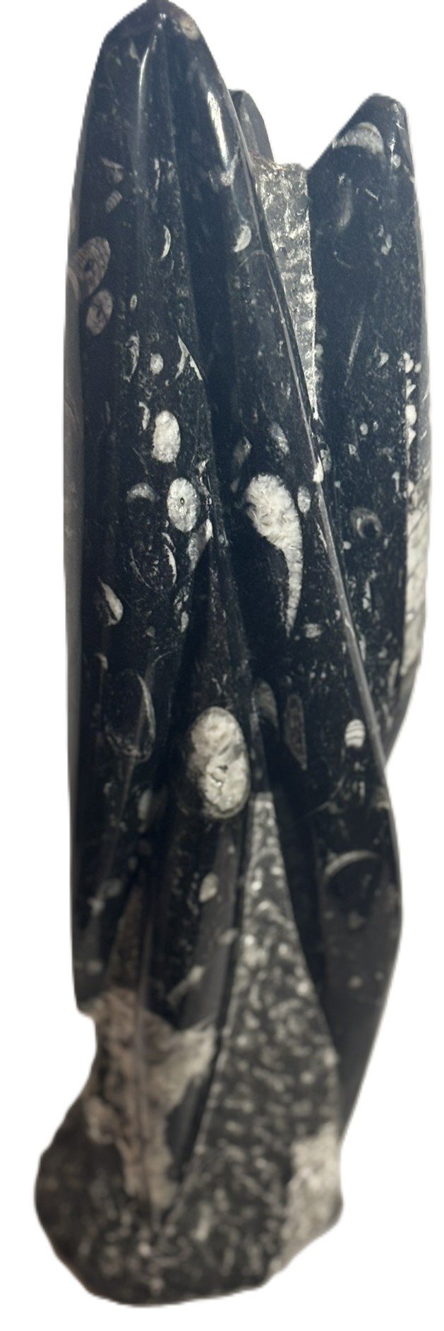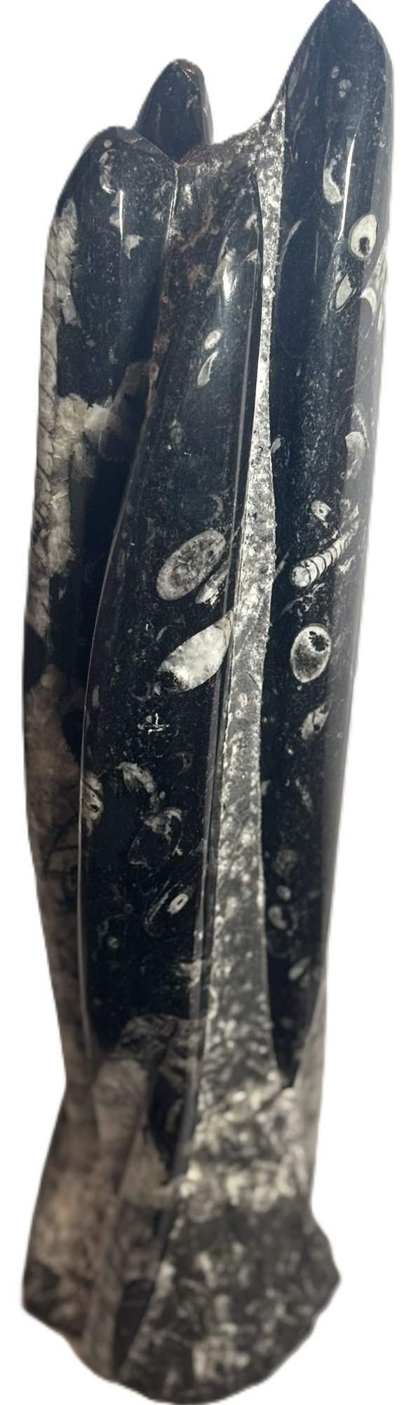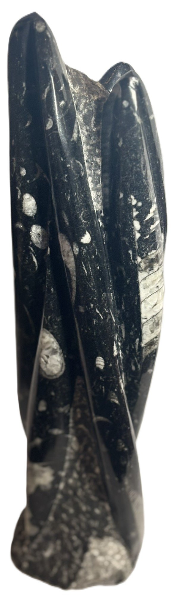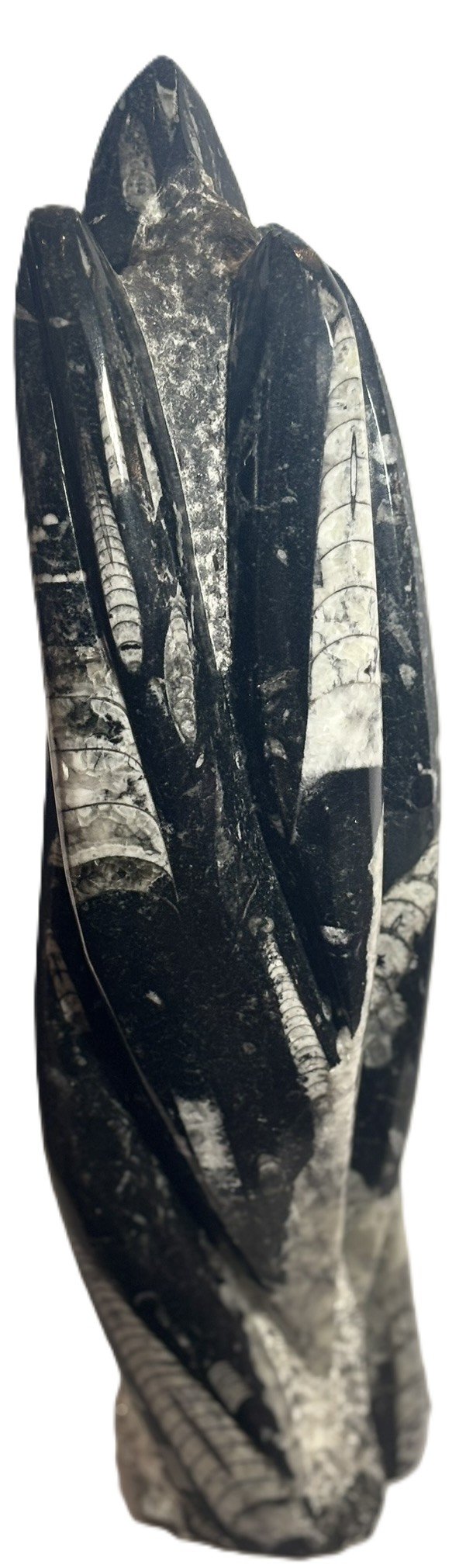 This hand-carved Orthoceras tower presents a vertical column of fossilised marine life from the Devonian period, over 400 million years in age. Sourced from the limestone beds of Morocco, each specimen showcases multiple Orthoceras shells embedded within a polished matrix, their chambered forms aligned in ascending order along the tower’s surface.