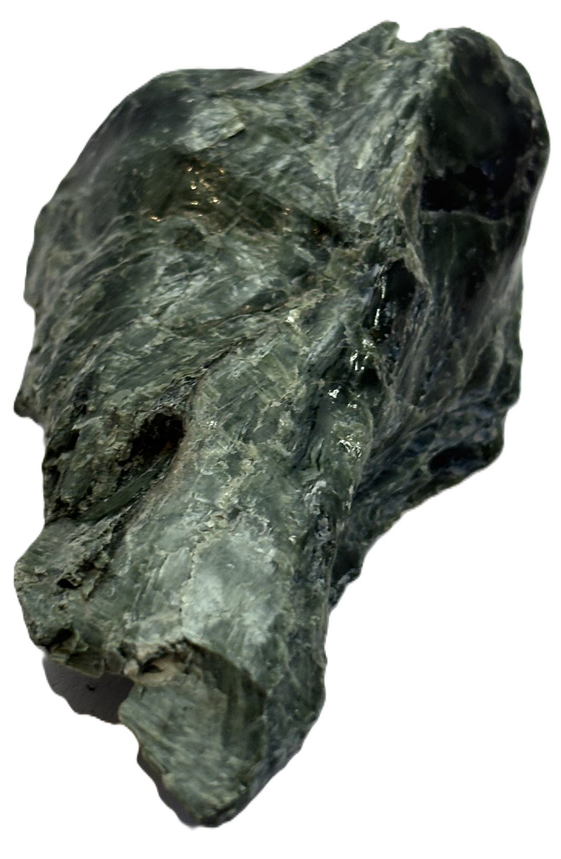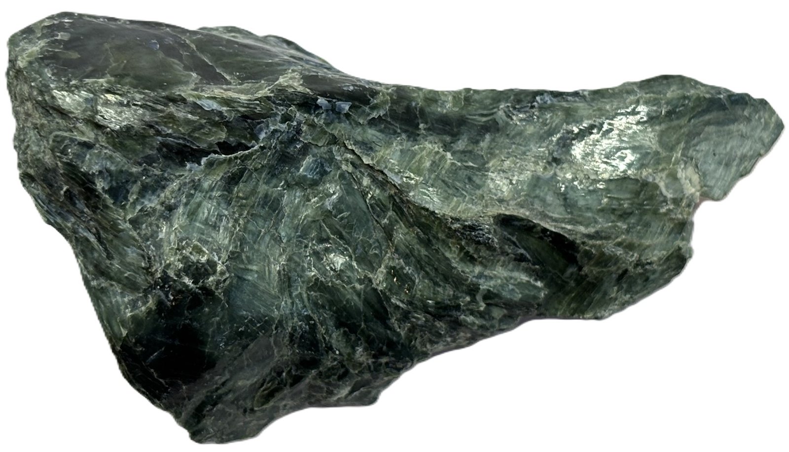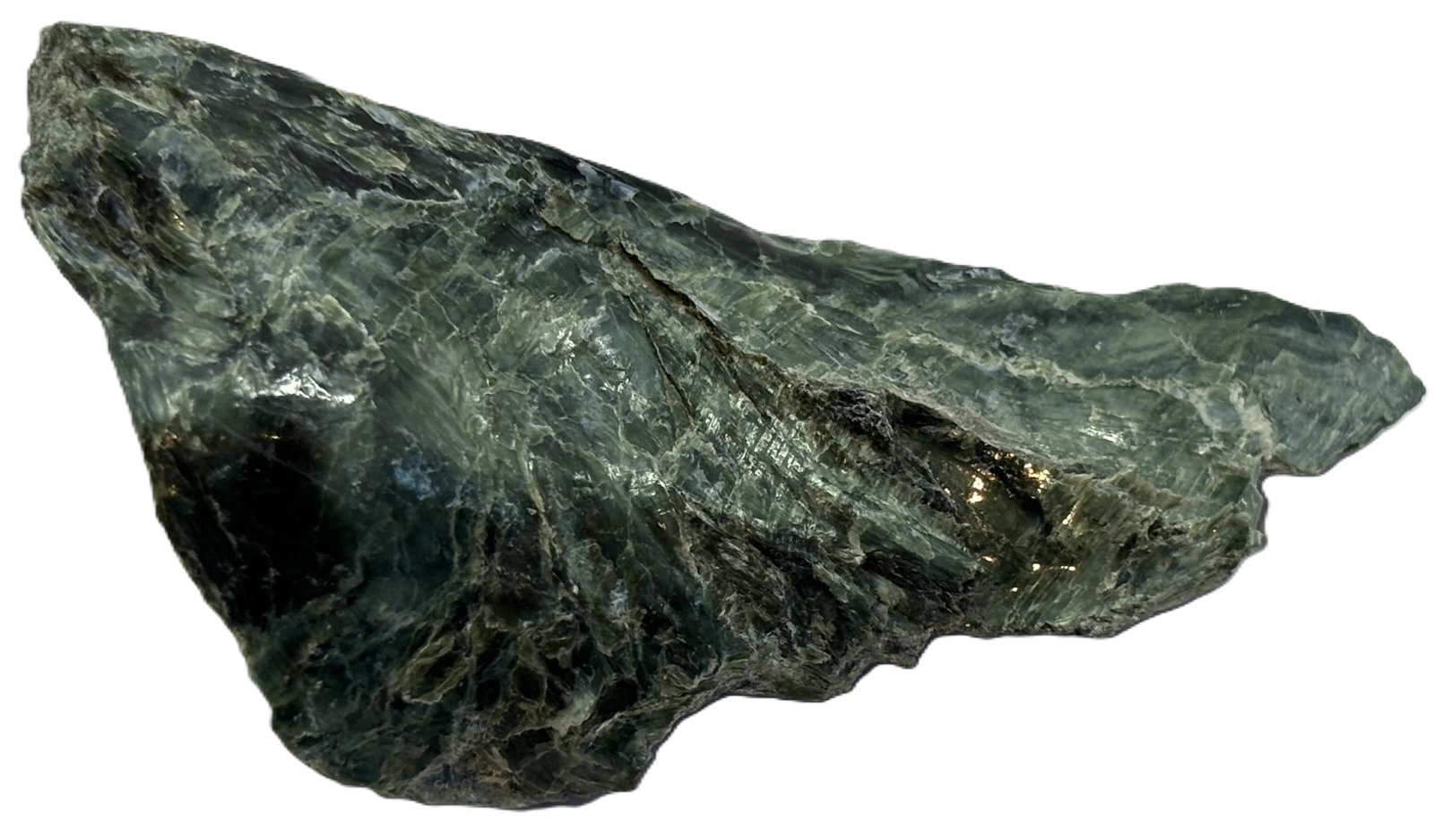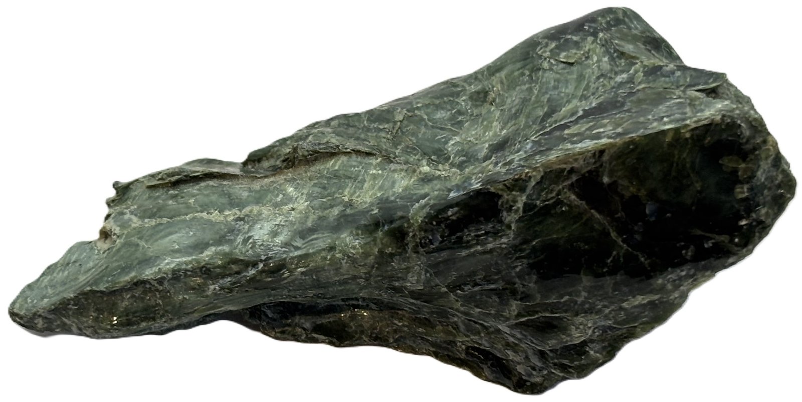 Celebrate the natural beauty of this serpentine specimen, a captivating piece that showcases a harmonious blend of dark green and lighter green hues. Its polished surface reveals intricate patterns and shimmering highlights, while subtle white and gold specks add a touch of elegance. This unique mineral specimen is a stunning addition to any collection or display.