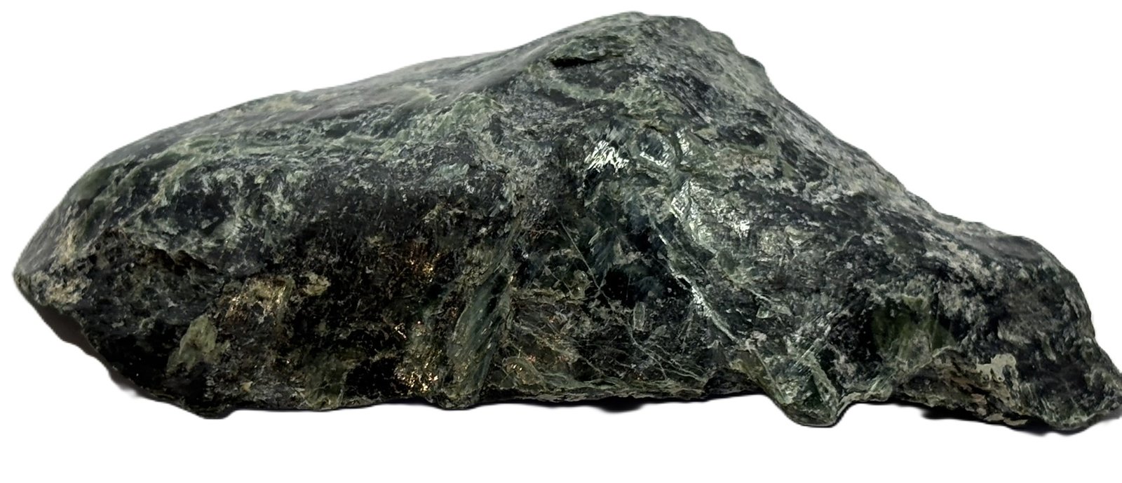 Celebrate the natural beauty of this serpentine specimen, a captivating piece that showcases a harmonious blend of dark green and lighter green hues. Its polished surface reveals intricate patterns and shimmering highlights, while subtle white and gold specks add a touch of elegance. This unique mineral specimen is a stunning addition to any collection or display.