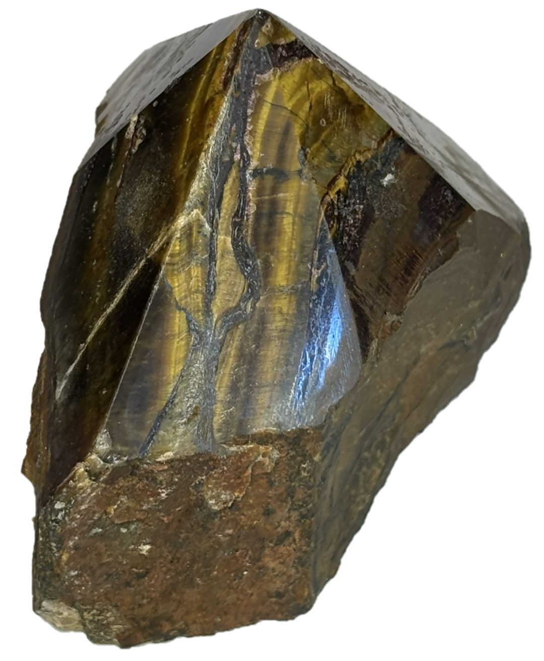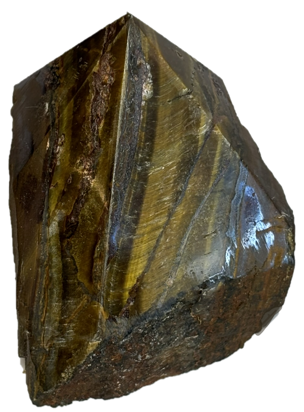 A particularly fine Tigers Eye specimen with vibrant colours, fantastic banding  & veining and sculpted with rough sides with a polished point. It radiates golden amber, ochre, and umber—each band revealing shimmering chatoyancy. Polished to a mirror-like finish, the stone reflects light from every angle, creating depth and captivating, colour-rich brilliance.